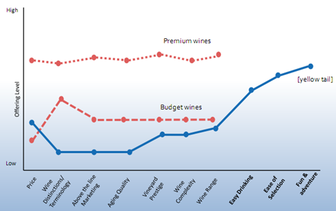 ในการวิเคราะห์กลยุทธ์ธุรกิจเพื่อหา Blue Ocean จริงๆ จะไม่ได้เป็นการมองเฉพาะด้านใดเพียงด้านเดียวแบบนี้ แต่จะนำจุดขายและจุดแข็งต่างๆ ของธุรกิจมาประมาณค่าลงในกราฟ (ดังรูปข้างต้น ซึ่งเป็นการสมมติการวิเคราะห์ธุรกิจไวน์ของบริษัทหนึ่ง) แล้วเลือก Value Innovation ชุดใหม่ของเราจากกราฟเส้นอื่นๆ ที่เห็น โดยตั้งคำถามเพื่อจัดกลุ่มจุดแข็งต่างๆ ตามระบบ ERRC Grid อันได้แก่